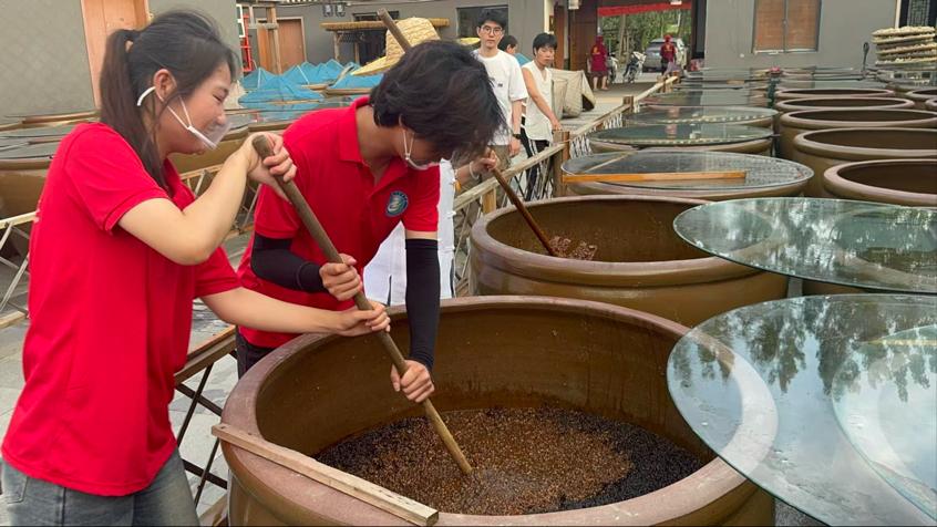 管理与信息学院“红踔堂”实践小分队开启非遗美食探访之旅,于7月6日走进全椒县两家非遗相关企业,深挖地方特色文化内涵。在全椒县礼庚管坝牛肉有限公司,队员们沉浸式学习“管坝牛肉”这一传统清真名菜的制作技艺——从精选优质牛肉,到复杂的腌制入味,再到慢火卤制的把控,非遗传承人对每道工序的细致讲解,让队员们深刻体会到传统美食背后“慢工出细活”的匠心。而在全椒县魏美玲食品有限公司,队员们则聚焦传统酿造工艺,系统了解徽酱从原料甄选(当地饱满大豆、小麦)到发酵成熟的全流程,见证阳光与匠心如何共同孕育出“色泽红亮、酱香浓郁”的徽酱,进一步认识到非遗美食对地方饮食文化的承载意义。