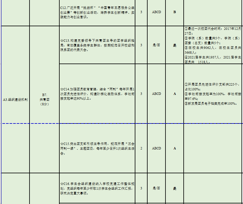 加强团员教育管理,结合“两制”每年开展团员先进性评价,开展支部共225个,占比100%;构建阶梯化激励体系,学社衔接发起率达100%,学社衔接率达97.6%。突出团支部在班级同学思政学习、志愿服务、社会实践等工作中的引领主导作用。完善支委会和班委会协同工作机制,倡导学生党员担任班级团支部书记,鼓励团支部书记兼任班长。强化“一切工作到支部”的理念,持续开展基层团组织规范化建设,激励先进团支部,整顿后进团支部,未达标的团组织及其委员不能参评团内荣誉。