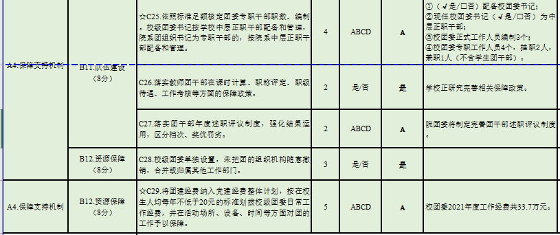 (四)强化经费支持保障。将团建经费纳入党建经费整体计划,在学校2021年度经费预算中,按在校生人均每年不低于20元的标准足额划拨团委日常工作经费,并在活动场所、设备、时间等方面对团的工作予以保障。各二级学院党委(党总支)根据工作任务,从党建经费中划拨一定团建经费,保障分团委工作有序开展。完善项目化工作机制,实现团内重点工作以可度量的项目在学校落地。