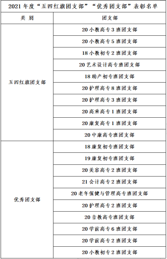 在校领导的支持和各学院的大力配合下,在各团支部和广大同学的积极参与下,我校2021年度“五四红旗团支部”和“优秀团支部”评选结果揭晓。经过各团支部自评、团委审核,拟评选20小教高专3班等10个团支部为“五四红旗团支部”,18康复初专班等10个团支部为“优秀团支部”。现将拟评选结果公示如下: