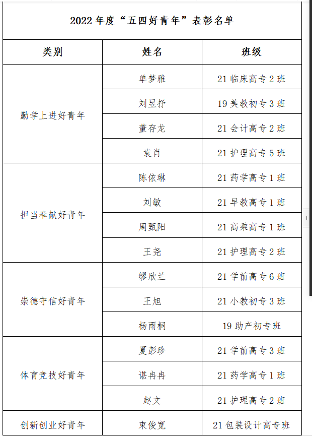 为深入学习宣传党的二十大精神,贯彻习近平总书记关于青年工作的重要思想,大力推进青年思想道德建设,积极培育和践行社会主义核心价值观,校团委经过审核决定:拟评选单梦雅15名同学“五四好青年”荣誉,现将拟评选结果公示如下:
