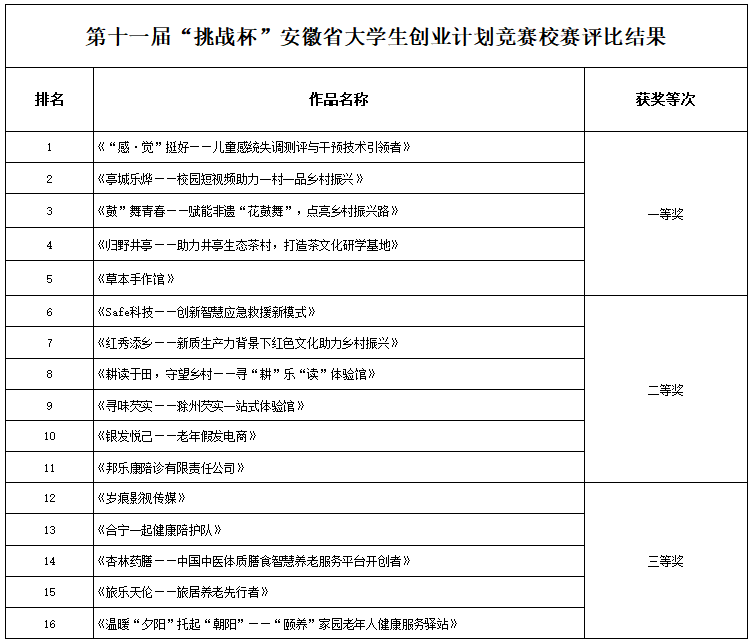 关于第十一届“挑战杯”安徽省大学生创业计划竞赛校赛评比结果的公示