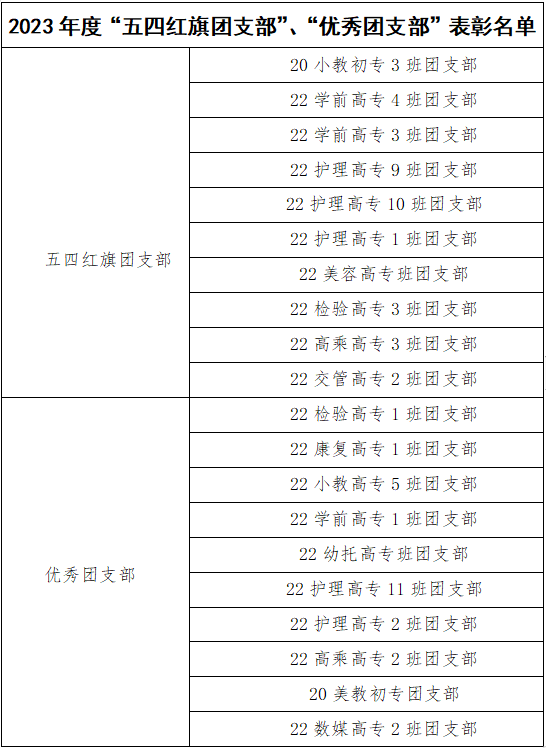 为深入学习贯彻习近平新时代中国特色社会主义思想,提升高校共青团组织力、引领力、服务力和大局贡献度,集中展现我校团支部建设成果和典型经验。校团委决定:拟评选20小教初专3班等10个团支部为2023年度“五四红旗团支部”,拟评选22检验高专1班10个团支部为2023年度“优秀团支部”。现将拟评选结果公示如下: