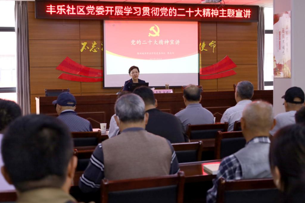 为进一步推动党的二十大精神深入社区、深入基层党员,让党的二十大精神在基层落地生根,5月26日下午,丰乐社区党委组织开展学习贯彻党的二十大精神主题宣讲会,校党委书记张志华同志进行宣讲,详细讲解党的二十大精神。社区主要领导干部、社区全体党员、社区退休老党员等近50人参加主题宣讲会。