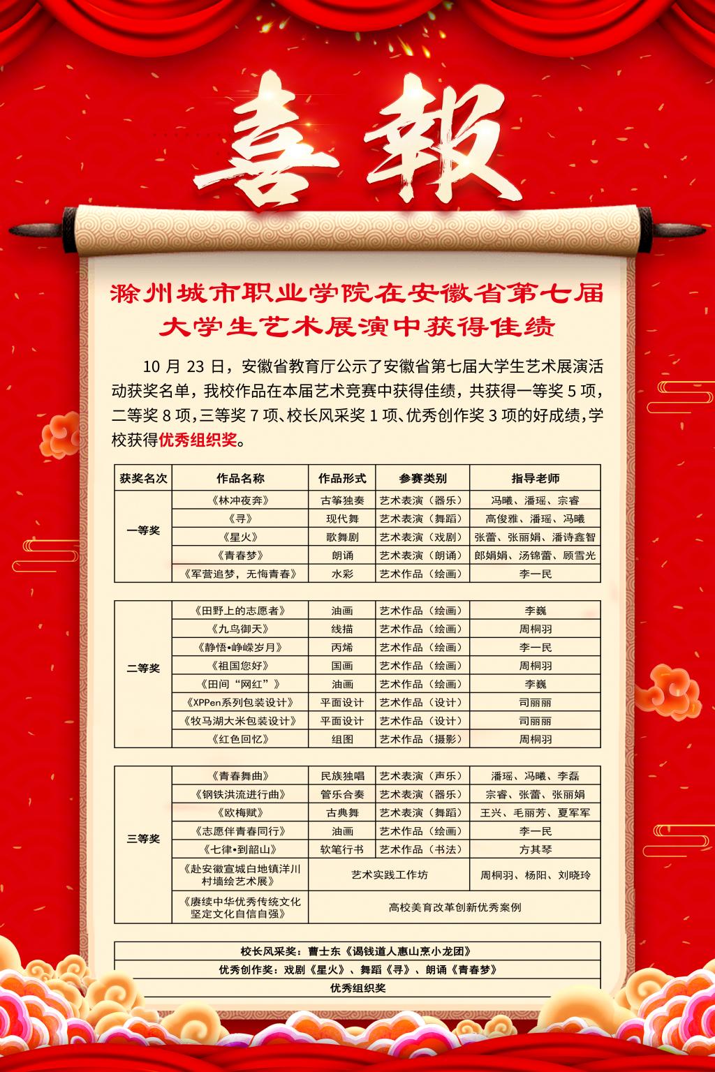近日,由安徽省教育厅主办的全省第七届大学生艺术展演活动获奖结果揭晓。我校在本次展演活动中大放异彩,共获得一等奖5项、二等奖8项、三等奖7项、校长风采奖1项、优秀创作奖3项、优秀组织奖1项,以优异成绩圆满完成比赛,充分展示我校建设省级“双高”校的美育育人成果。热烈祝贺!
