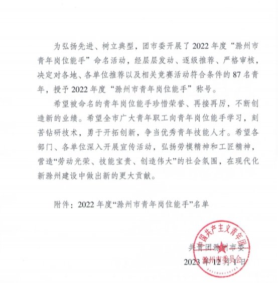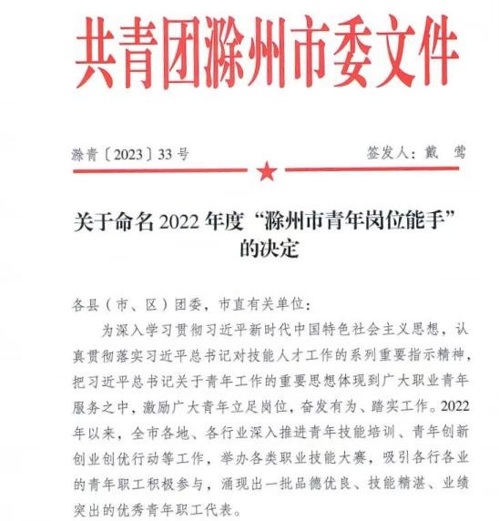 为深入学习贯彻习近平新时代中国特色社会主义思想,认真贯彻落实习近平总书记对技能人才工作的系列重要指示精神,把习近平总书记关于青年工作的重要思想体现到广大职业青年服务之中,激励广大青年立足岗位,奋发有为、踏实工作。共青团滁州市委下发了《关于命名2022年度“滁州市青年岗位能手”的决定》,我校杨静怡、赵悦两位教师荣获2022年度“滁州市青年岗位能手“称号。