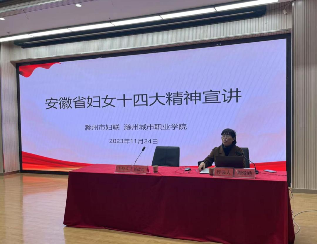 11月24日,我校联合市妇联、市中院、南谯区法院共同开展安徽省妇女十四大会议精神宣讲暨法治宣传进校园活动。活动由校工会主席钱庆兵主持,各二级学院师生代表三百余人参加。
