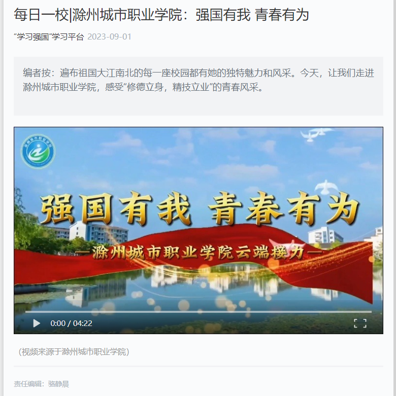 9月1日,“学习强国”学习平台“每日一校”栏目专题展播我校“强国有我 青春有为”云端接力视频,全面展示我校的办学特色和青年风采。热烈祝贺!