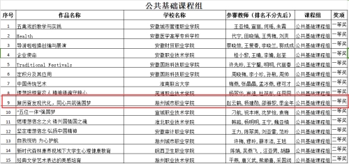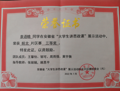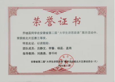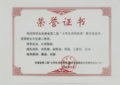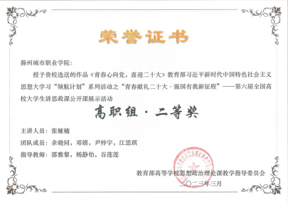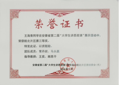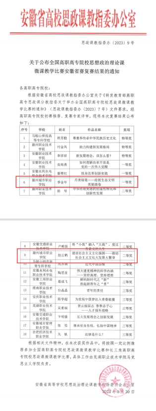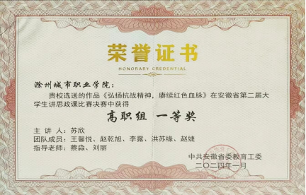 在安徽省首届大学生讲思政课公开课展示活动获片区赛三等奖1项;在教育部“领航计划”第六届全国大学生讲思政课公开课展示活动中,荣获高职组二等奖1项,优秀奖1项;在安徽省第二届大学生讲思政课片区赛中获二等奖1项,三等奖两项。苏欣同学代表我校参加由中共安徽省委教育工委主办的安徽省第二届大学生讲思政课展示活动高职组决赛荣获一等奖!