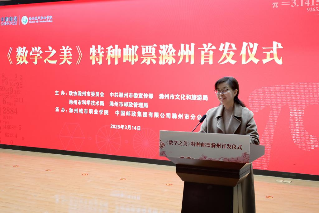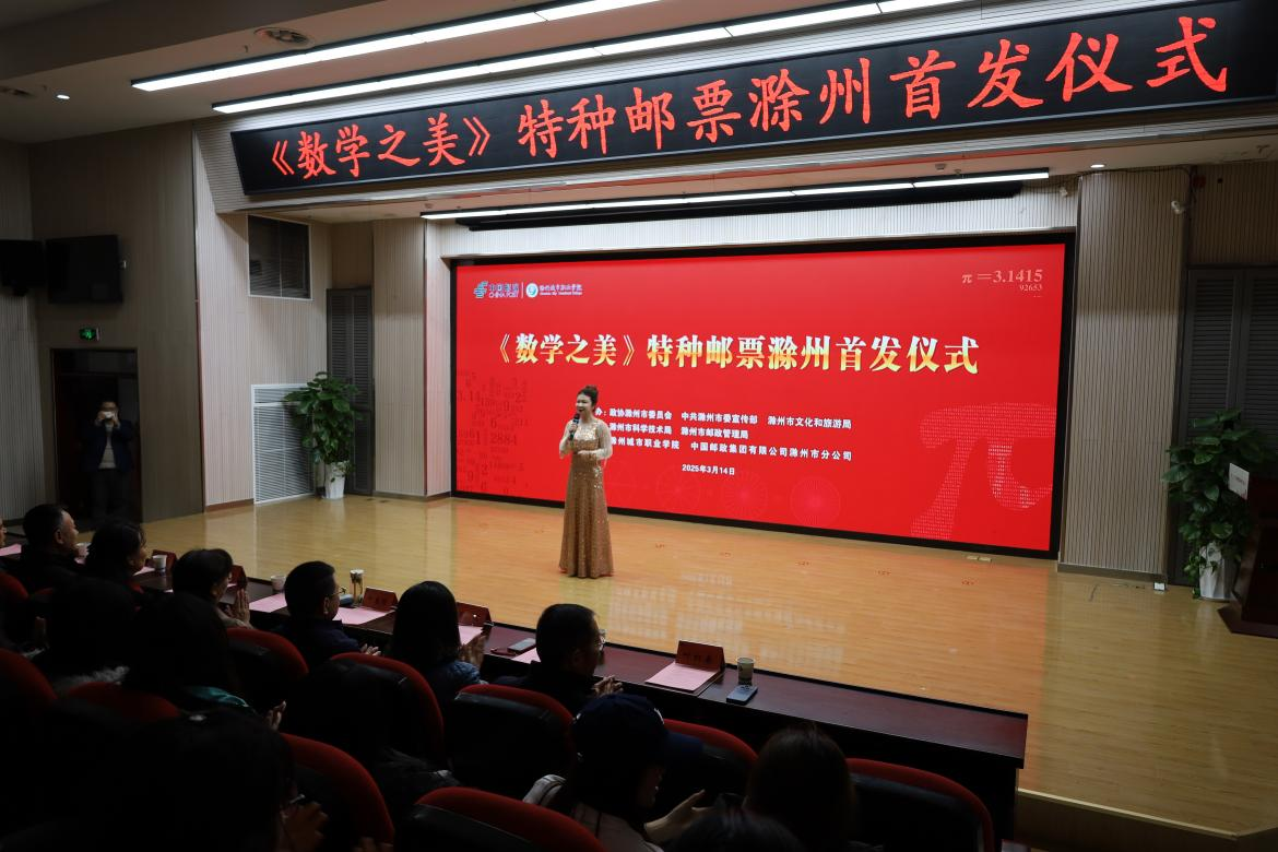 3月14日,由我校承办的《数学之美》特种邮票滁州首发仪式在图文中心四楼报告厅举行。滁州市政协副主席李世平,滁州市邮政管理局党组书记、局长缪华春,滁州市邮政分公司党委书记、总经理万顷,滁州市委宣传部机关党委书记乐世万,滁州市科技局党组成员、副局长黄静,滁州市文化和旅游局四级调研员黄翠芳,滁州市邮政分公司党委委员、副总经理叶红春,我校党委书记王燕永,党委副书记牛春雨出席仪式,相关部门负责同志及各学院学生代表、演员、志愿者300多人齐聚,共同见证邮票首发。