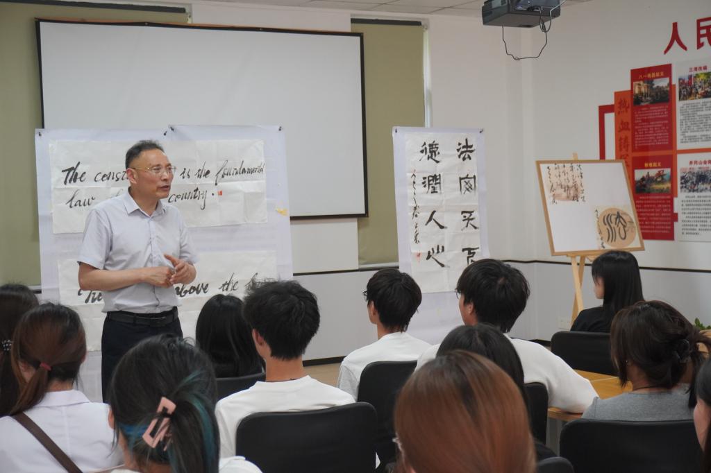曹士东以深厚的法学功底,从中华法系的历史脉络开篇,生动讲述了商鞅变法开创成文法体系的里程碑意义。他巧妙地将法律与传统书法艺术相联系,阐释了法治权威的文化表达形式。通过解读新修订的《职业教育法》,分析了该法在保障公民技能发展权、确立职业教育“类型教育”地位的时代价值。讲座重点解读了习近平法治思想的核心要义,并强调其作为全面依法治国根本遵循的地位,深入剖析了“坚持党对全面依法治国的领导”“坚持以人民为中心”等精髓,讲解了统筹推进国内法治与涉外法治的战略意义。整场讲座以宏阔的历史视野和严谨的学理逻辑,完整呈现了中国特色社会主义法治从文化根脉到实践创新的发展全景。