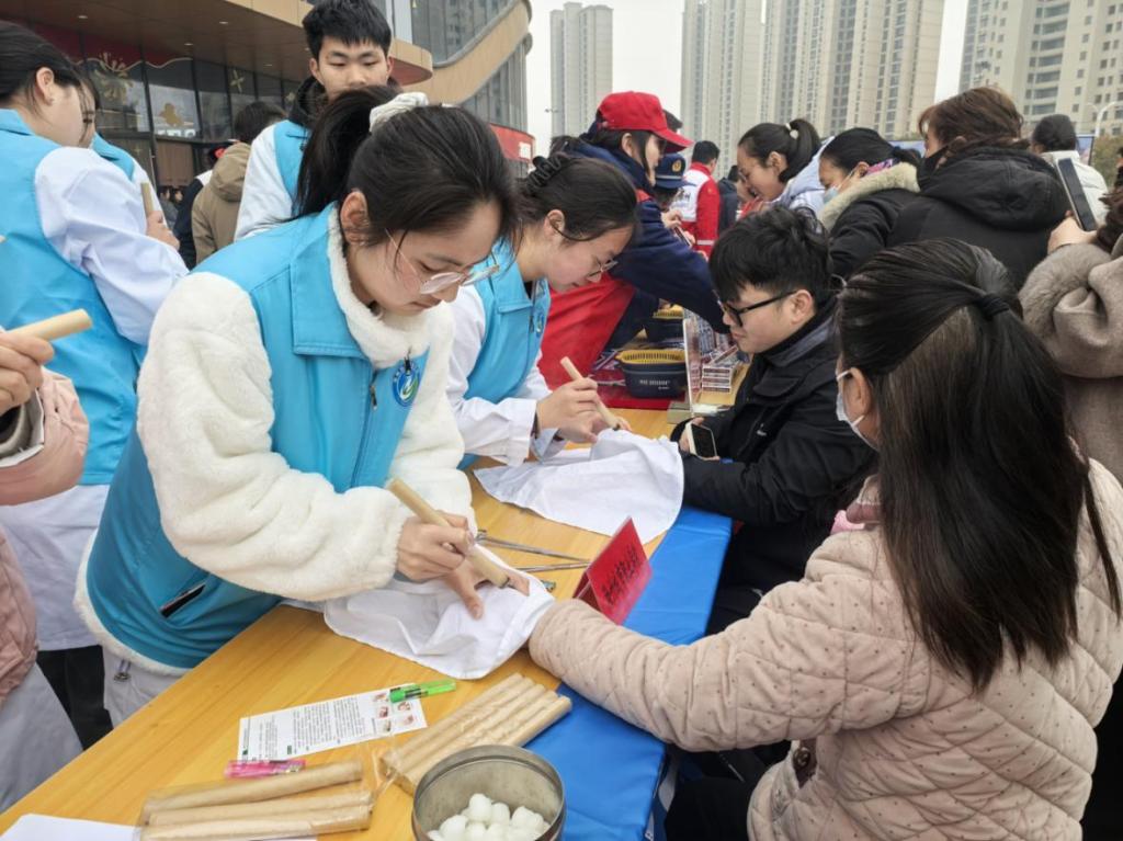 学校在公益集市上设立多维度健康服务平台。急救技能实训区开展海姆立克急救法标准化操作流程演示,通过情景模拟教学方式引导周边市民掌握应急救护技能。中医药非遗传承展区设置中药香囊手作工坊,青少年群体在指导下完成具有防疫功效的传统香囊制作,沉浸式体验中医药文化精髓。在艾灸义诊区域,志愿者们详细询问市民的身体状况运用艾灸温补技术开展针对性调理,并结合调理过程进行中医药养生知识宣教,有效提升市民中医药文化认知度,使传统文化传承与雷锋精神弘扬形成价值共振。