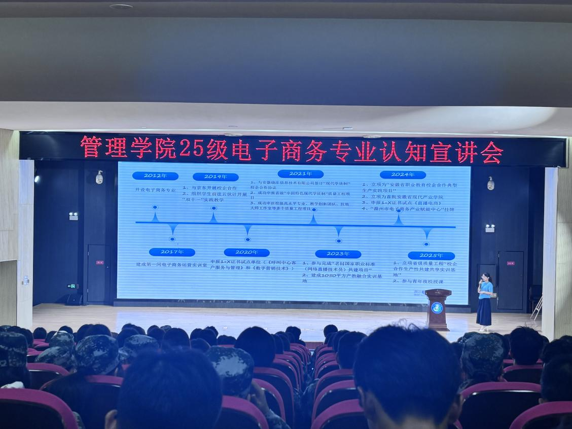 为帮助2025级电子商务专业新生深入了解专业内涵、明确学习方向,9月11日中午,电子商务专业在润德楼四楼报告厅举办了专业认知教育。会议伊始,电商专业负责人胡海敏老师从专业发展历程、建设成果、培养目标及人才培养模式等方面,对电子商务专业进行了系统介绍。她提到,电子商务专业紧跟行业发展趋势,注重理论与实践相结合,近年来在技能竞赛、校企合作、学生就业等方面取得了显著成果。她表示,专业将持续优化课程体系,强化...