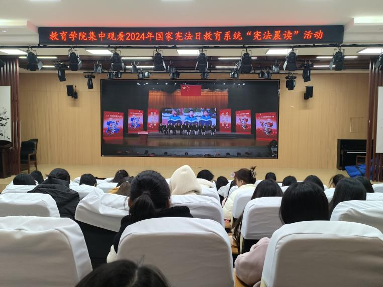 为引导学生学习宪法、尊崇宪法,助力法治校园建设,教育学院于12月3日至4日组织开展“宪法晨读”活动,同时组织学生在线直播观看2024年国家宪法日教育系统“宪法晨读”活动。12月3日上午,教育学院组织学生代表在恩镇楼前举行“宪法晨读”活动。活动由学生代表王旭领读,师生共同诵读宪法节选内容,感受宪法庄严权威的同时,深入学习其基本条款与内容。晨读现场,学生们精神饱满,朗朗读书声响彻校园,充分展示了新时代青年对宪...