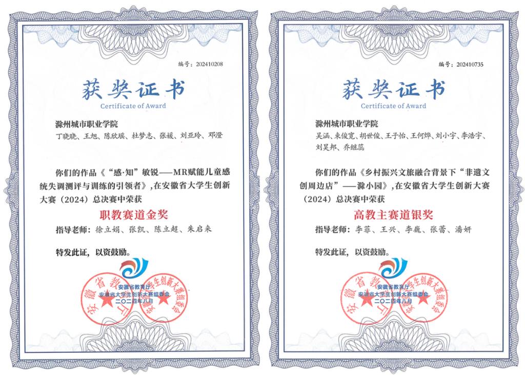 经过网评、现场总决赛等多环节的激烈角逐,我校教育学院丁晓晓团队的参赛项目《“感·知”敏锐——MR赋能儿童感统失调测评与训练的引领者》获得职教赛道创意组金奖;艺术与传媒学院吴涵团队的参赛项目《乡村振兴文旅融合背景下“非遗文创周边店”——滁小园》获得高教主赛道创意组银奖,另有23个项目获省赛铜奖。